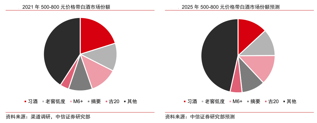 茅台一枝独秀,牢牢占据2000元以上超高端价格带。我们预计,2021年终端成交价2000元以上的价格带营收规模约920亿元以上,2025年有望达到1400亿元以上,2020-25年复合增速为11%左右。2000元以上价格带已被茅台牢牢占据,其他品牌酱酒仅是形象产品基本没有实际销售,目前茅台已形成由普飞-生肖-精品-珍品-年份酒等构成的产品矩阵,基本覆盖2000元至上万元所有价格带超高端消费者需求,并持续供不应求,未来5-10年预计也难以有其他包括其他香型的白酒品牌挑战茅台地位。