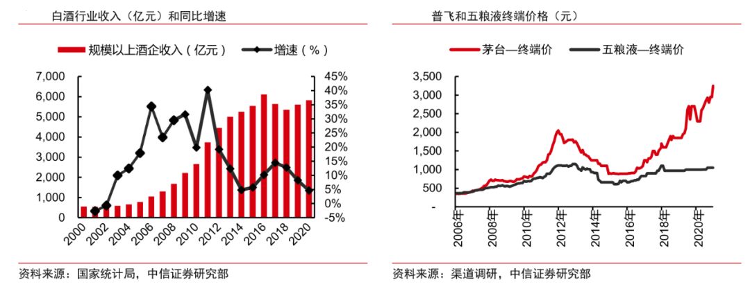 2016年以来,酱酒发展主要经历两个阶段:①2016-2018年,茅台初露锋芒,其他酱酒企业在品牌、产品、营销、渠道等多方面进行改革,为后期高速发展打下坚实根基。②2019年以后,茅台一支独秀,形成众星拱月之势,酒厂和渠道共同努力做大市场,酱酒消费者受众不断扩大,形成正向反馈。茅台,品牌力再上台阶,尤其是非标酒构建成超高端产品矩阵,系列酒也实现全面顺价,配额供给紧俏。习酒,2020年销售突破百亿,窖藏1988成为50亿次高端大单品,畅销全国;郎酒成功打造郎酒庄园模式,青花郎逐步跻身高端白酒龙头序列;钓鱼台、国台、珍酒、金沙等均实现跨越式发展,2016-2021收入CAGR均在40%以上。