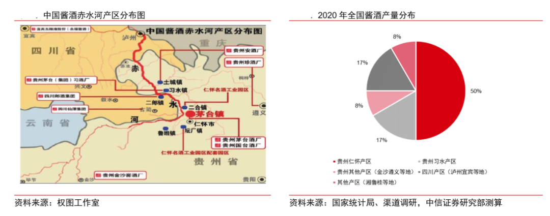 2020年和2021年全国酱酒产量分别约60万吨,主要集中在泛赤水河流域产区。酱酒产区集中在沿赤水河流域由南向北,包括金沙、仁怀、习水、古蔺、赤水、泸州等地,这些地区的生态环境、气候条件、土壤水质对优质酱香基酒的酿造具有不可复制性,为多家国内知名酒企提供了极佳的酿造环境。仁怀市茅台镇是酱酒生产酿造的黄金产区,酿酒历史悠久、文化底蕴深厚、生态环境独特,汇聚着大大小小超过千家酒企,被誉为“中国第一酒镇”、“世界酱香型白酒主产区”、“中国酒都核心区”等称号。2020年,酱酒行业产量约60万吨,赤水河流域产量预计达到50万吨左右,贵州省产量至少在40万吨以上。