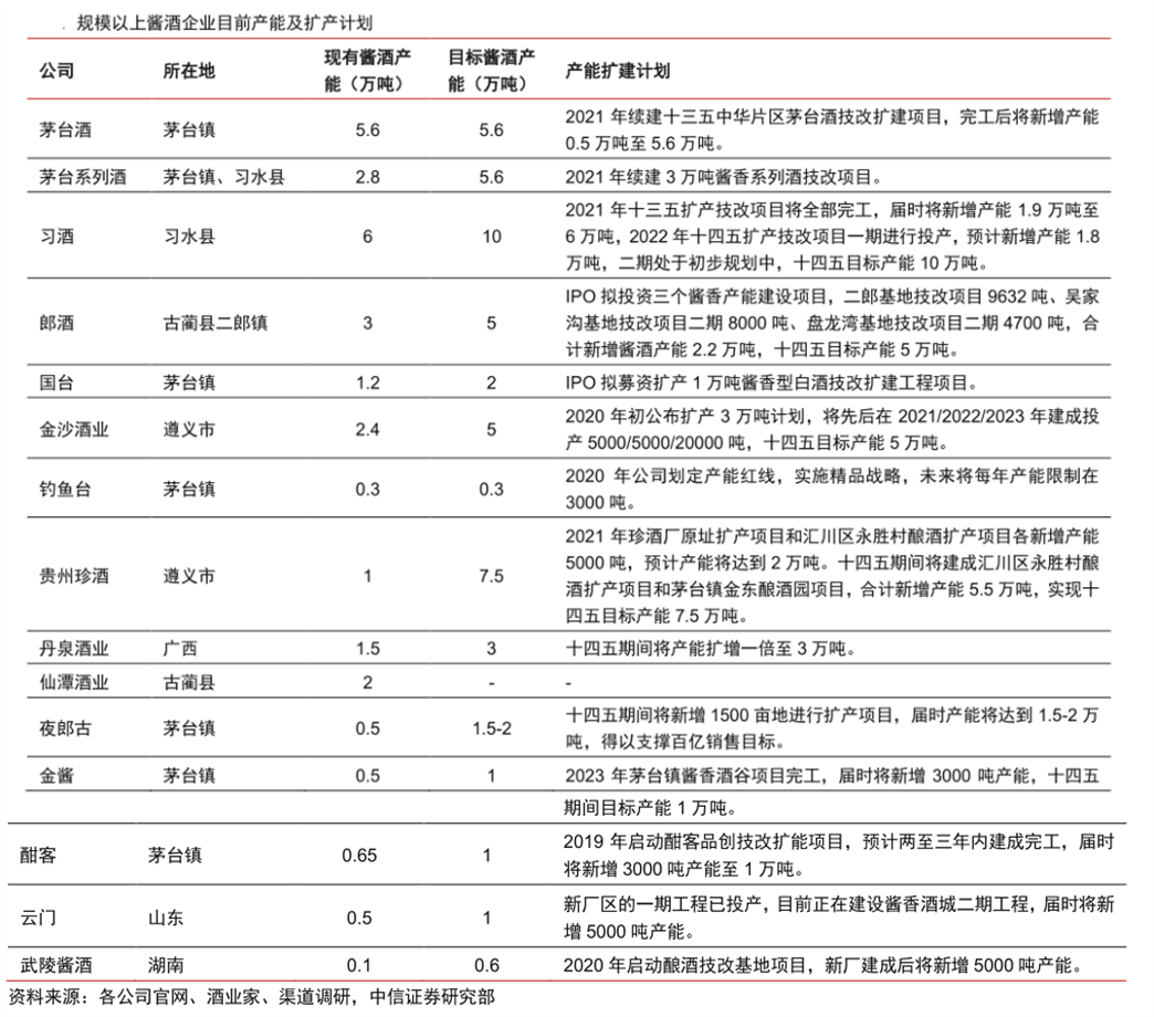 行业加速扩张产能,预计新增产能主要在2025年前后开始释放。2019和2020年开始,酱酒企业纷纷开始执行扩产计划,根据初步统计,本轮酱酒扩产将新增20-30万吨酱酒产能,且基本均为大曲坤沙酱酒产能。而从产能建设到成品酒产能实际落地一般至少需要5-7年的时间,因此,我们预计本轮新增扩产的产能最快也要在2025年前后开始集中释放。