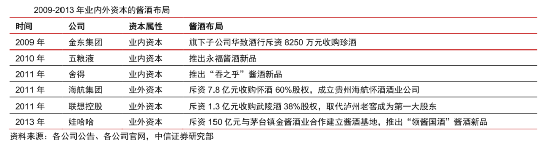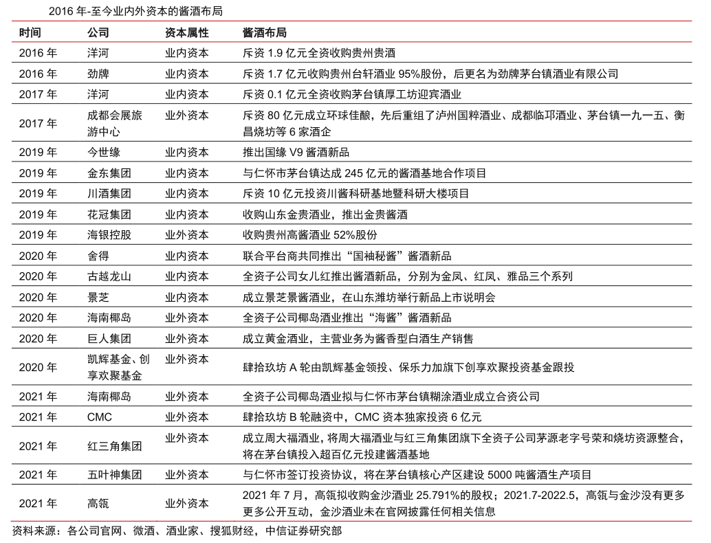 业内外资本加速布局,但2021H2管控开始加强。茅台的需求溢出为其他酱酒品牌创造了更加宽阔的价格带,众多酒企通过提价和推新陆续布局高端及次高端核心市场,如习酒、郎酒、国台等纷纷推出战略大单品并不断提价,进一步实现产品占位。酱酒行业的蓬勃发展和宽广前景也吸引业内外资本再次加码布局,业内酒企如洋河、劲牌、今世缘、舍得纷纷推出酱酒新品或收购赤水河流域的酱酒厂,业外大型集团如海银、巨人、红三角也通过兼并收购现有酒企或独资成立子公司涌入酱酒行业。2021年下半年开始,业外资本扩张趋势有所放缓,2021年6月,国台酒业中止IPO;2022年,郎酒主动撤回IPO。