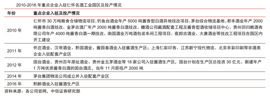 贵州省仁怀市为酱香白酒最大产区,年产量高达30万吨,茅台镇为核心产区。仁怀市酱酒规划生产区87.3平方公里,酱酒生产酿造和包装仓储主要集中在15.03平方公里的茅台镇和13.69平方公里的仁怀名酒工业园区。仁怀全市拥有超6万口窖池,2020年投产企业多达700余家、投产窖池多达3万余口,现酱香白酒年产量为30万吨,其中茅台镇产量超过20万吨。成立于2011年的仁怀名酒工业园区,地处五岔河谷地带,包含酱酒生产区和配套产业区,生产区由三合镇、火石岗乡、大坝镇等乡镇区域组成,配套产业区则位于坛厂镇。工业园区聚集夜郎古、君丰、大唐等众多名优酒企、国台和钓鱼台的异地厂房以及茅台综合物流基地,入驻企业高达95家。2020年园区投产企业36家、基酒产量5万多吨,2016-2020年产量CAGR为37%。