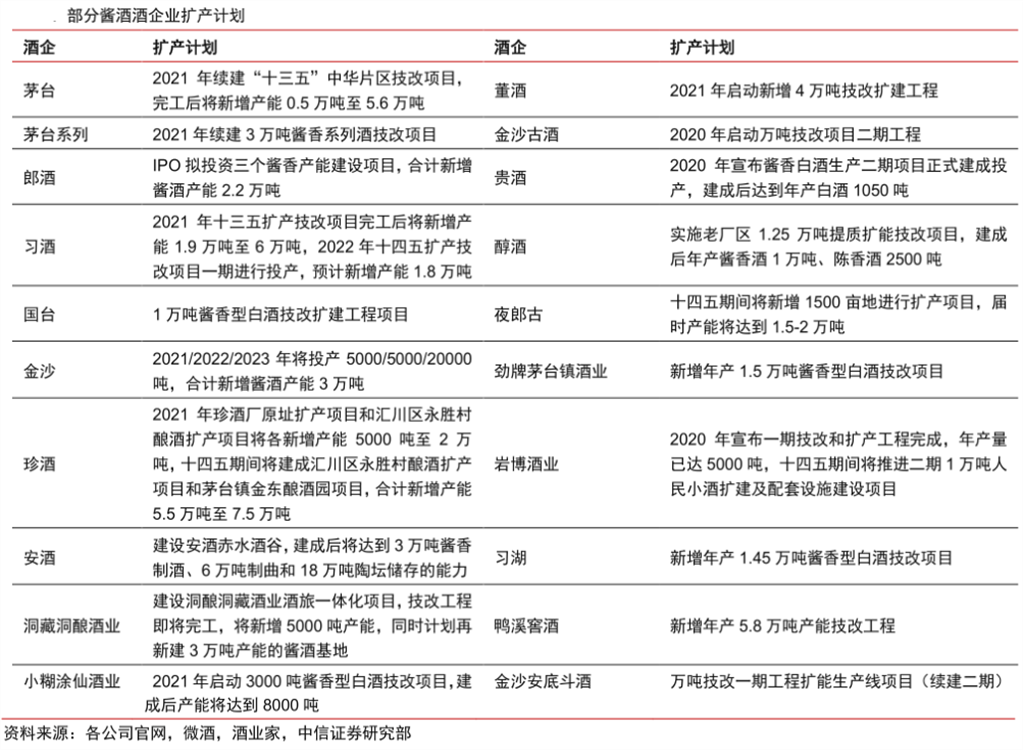 酱酒企业积极扩建产能。酱酒行业的快速发展也导致了大批茅台镇酱香酒企纷纷开始进行产能扩张和基础设施建设。国台在2008年投资数千万建设总面积达2000余平方米的名人珍藏酒窖,于2010年落成,2011年启动国台酒庄有限公司建设,当年投产。郎酒则在 2012年分别投资两河口、吴家沟酱酒生产基地两大扩产项目,同时规划建设2000亩天宝峰储酒库,目标打造世界级酱香酒谷。