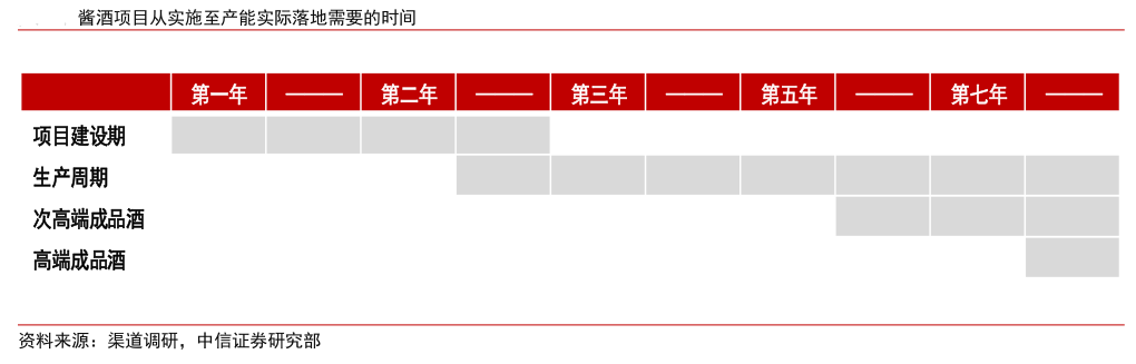 酱酒行业短期内基酒产能供给仍继续受限。上一轮酱酒行业整体的扩产计划主要集中在2010-2012年,但由于2013-2015年处于行业调整期,开工率普遍不足,直至2016年部分酱酒企业才开始逐步恢复正常的生产,2019-2021年前后才基本处于满产状态。目前300-800价格带的坤沙酱酒普遍使用的是3年的基酒、较少部分使用的是5年基酒,短期内行业优质酱酒产能供给将持续不足。