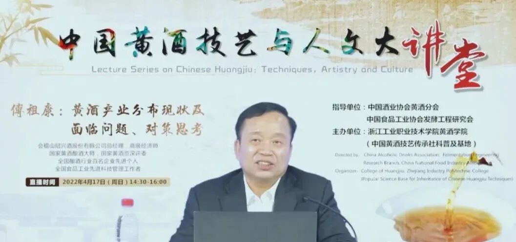 4月17日,会稽山总经理傅祖康作客由中国酒业协会黄酒分会、中国食品工业协会发酵工程研究会指导,浙江工业职业技术学院黄酒学院主办的“中国黄酒技艺与人文大讲堂”。傅祖康通过线上就“黄酒产业分布现状及面临问题对策思考”作了专题分享。