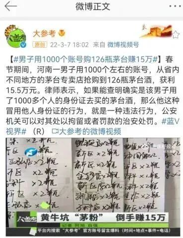 日前,据“大参考”报道,在春节期间,河南一男子用1000个左右的账号,从省内不同地方的茅台专卖店抢购到126瓶茅台酒,获利15.5万元。