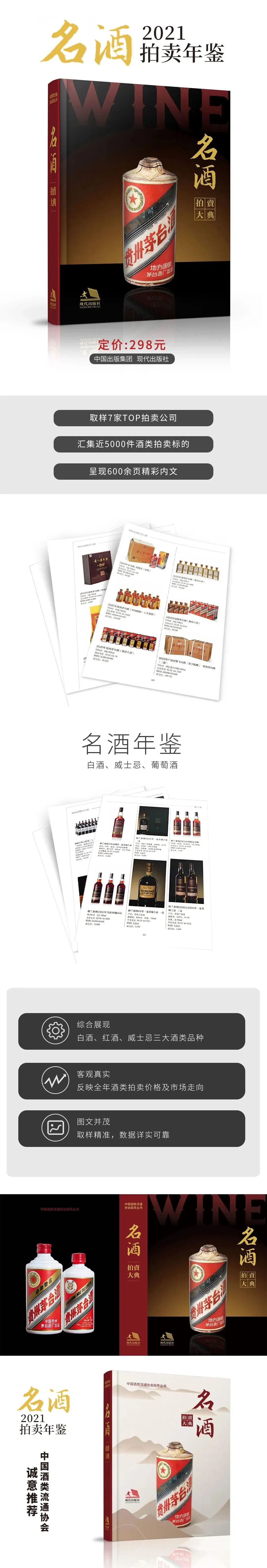 中国酒类流通协会收藏与市场专业委员会首次推出的《2021名酒拍卖年鉴》-书计划于2022年6月由三联出版社出版发行。该书采集七家国内头部拍卖公司,一年时间近六千个酒类拍卖标的真实成交数据,以中国陈年白酒为主体,威士忌及葡萄酒为补充。该书客观全面的反映一年来酒类拍卖市场及价格走向,600页的丰富内容详实可靠图文并茂,是指导名酒收藏及市场行情的权威工具书。