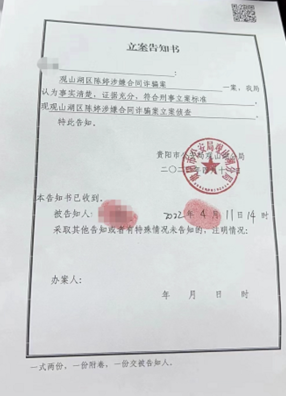 4月11日,记者从当事人贾先生那里了解到,他们报案的陈某涉嫌诈骗案,现在已经拿到立案告知书。贵阳市公安局观山湖分局对观山湖区陈某涉嫌合同诈骗案认为事实清楚,证据充分,符合刑事立案标准,对陈某涉嫌合同诈骗案立案侦查。