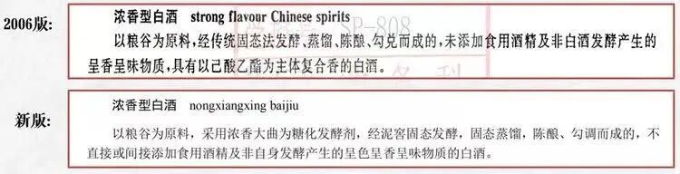 相对于老标准,新的浓香型白酒定义中强调了“浓香大曲”、“泥窖固态发酵”、“不直接或间接添加食用酒精及非自身发酵产生的呈色呈香呈味物质”。