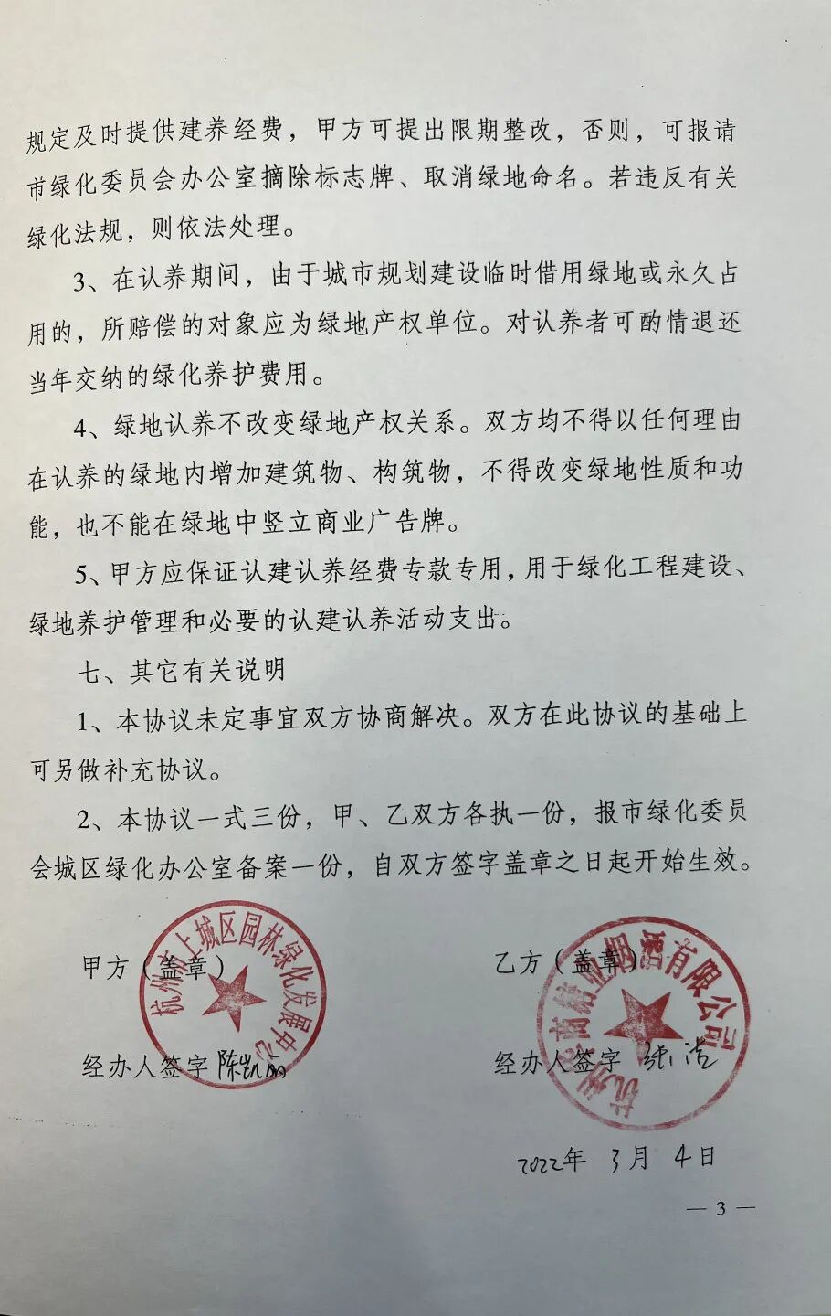 完成栽种后,公司还签订了《杭州市绿地认养协议书》,表达了对生态环境的热爱之情,以及愿意为之持续贡献力量的决心。