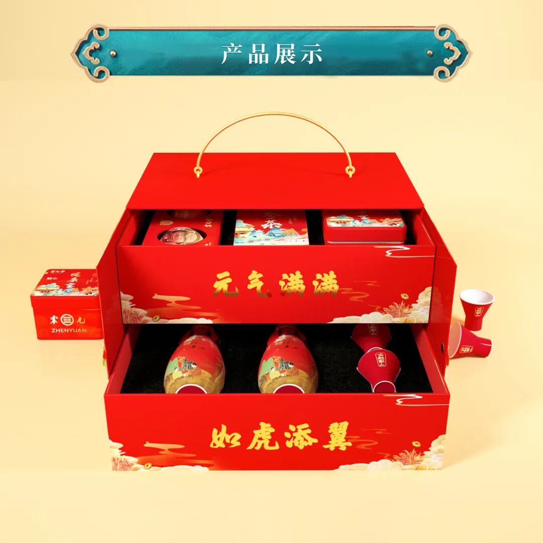礼盒的整体设计采用红金为主要色系,产品既包含震元堂的健康礼包,又拥有古越龙山的特色黄酒,两大绍兴老字号品牌联合出品,不仅仅是国潮范,也是绍兴味,更是新年礼!