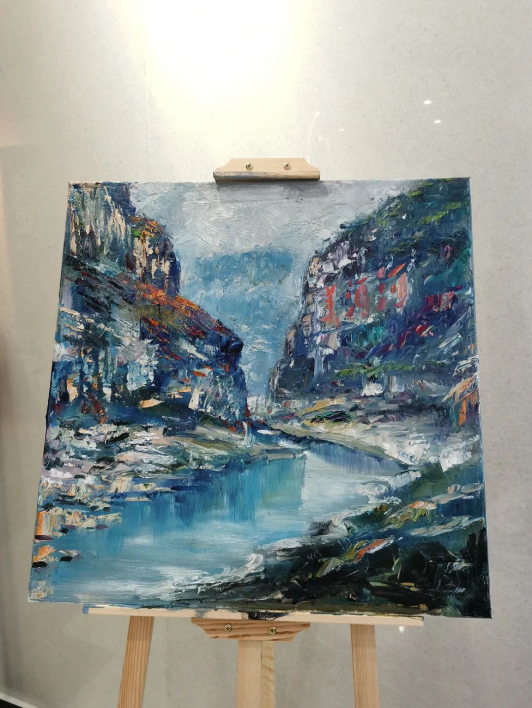 浙江具象派油画家赵巍,现场以“美酒河”(即茅台镇赤水河)为题,利用滚筒代替传统笔刷,创作出一幅别出心裁的油画作品,令人耳目一新。