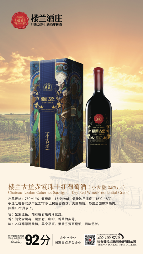 楼兰酒庄不仅拥有深厚的酿酒文化底蕴、新疆吐鲁番产区独特的风土环境,并保留有全国唯一正常运转且拥有黄金树龄的酿酒葡萄母本园,酿造出具有国际品质的卓越葡萄酒。近年来,楼兰小古堡更是成为国际葡萄酒舞台上一颗灿烂的明珠,成为G20峰会选定用酒、荣获布鲁塞尔国际葡萄酒大赛金奖、连续两年获得罗伯特·帕克团队92分评级、历届亚欧博览会指定用酒等等系列权威荣誉。
