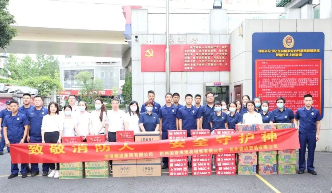 本次慰问活动为浙商糖酒“恰风华七十年”系列之茅台公益行活动,由浙商糖酒集团联合杭州壹玖贸易有限公司、杭州宏强酒业有限公司共同参与,向奋战在基层工作一线的消防员们送去了一批消暑慰问品,包括水果、饮料、能量棒等,并对他们在酷暑盛夏里的坚持奋战,为人民群众生命财产安全保驾护航做出的贡献表示感谢。