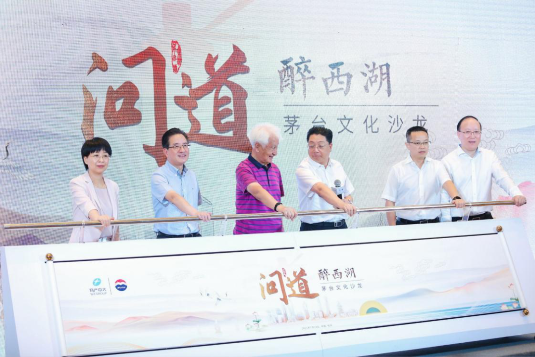上午,首期物产中大茅台文化沙龙正式启动。王挺革主持沙龙启动仪式。6位沙龙代表缓缓推开画卷,展现出本次沙龙活动主题——问道醉西湖。