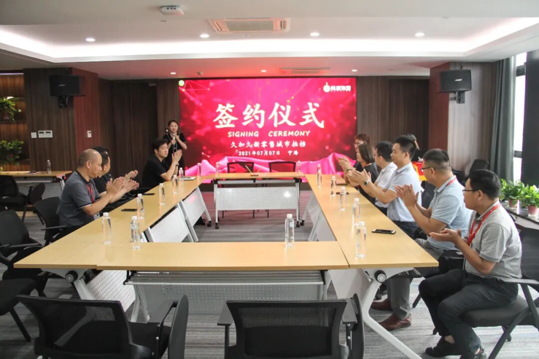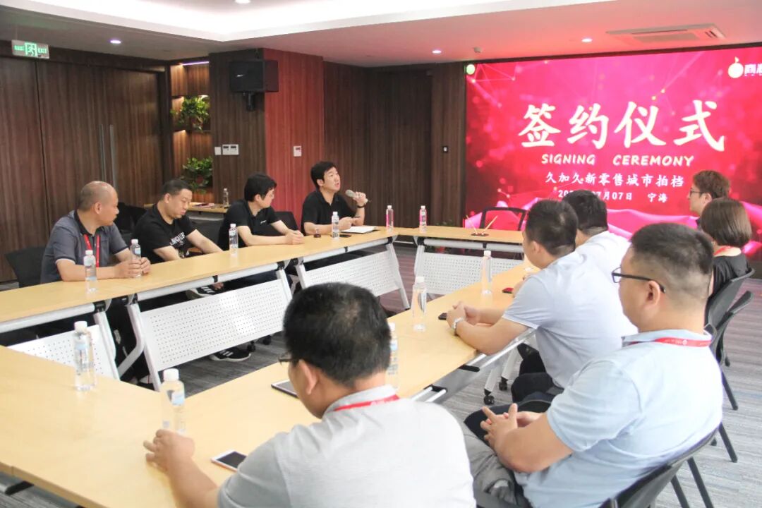 2021年7月7日下午,久加久新零售项目宁海城市拍档战略合作签约仪式在久加久总部商源大厦盛大举行,久加久新零售事业部常务副总经理俞杨先生、宁海城市拍档宁波圈加圈商贸股份有限公司王总作为双方代表签约,久加久新零售项目各战区负责人出席并共同见证了此次签约仪式!