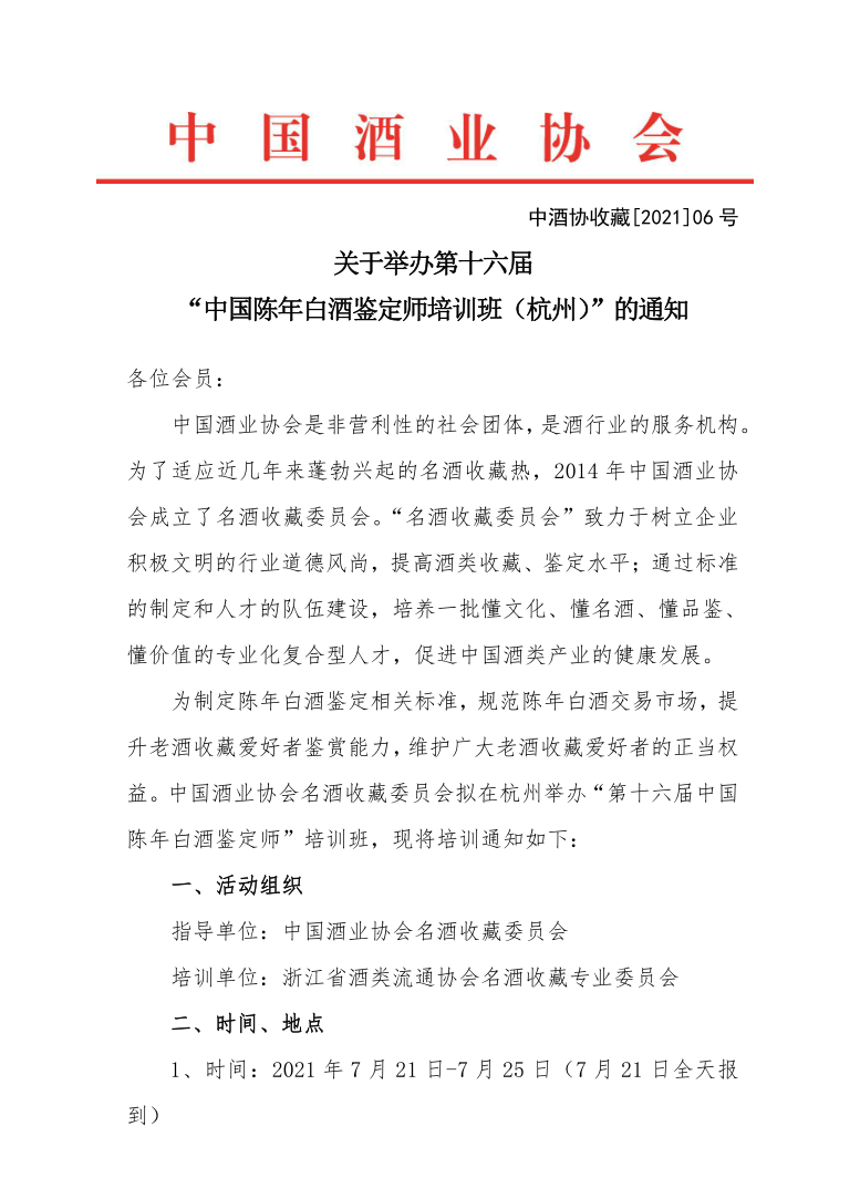 中国酒业协会是非营利性的社会团体,是酒行业的服务机构。为了适应近几年来蓬勃兴起的名酒收藏热,2014 年中国酒业协会成立了名酒收藏委员会。“名酒收藏委员会”致力于树立企业积极文明的行业道德风尚,提高酒类收藏、鉴定水平;通过标准的制定和人才的队伍建设,培养一批懂文化、懂名酒、懂品鉴、懂价值的专业化复合型人才,促进中国酒类产业的健康发展。为制定陈年白酒鉴定相关标准,规范陈年白酒交易市场,提升老酒收藏爱好者鉴赏能力,维护广大老酒收藏爱好者的正当权益。中国酒业协会名酒收藏委员会拟在杭州举办“第十六届中国陈年白酒鉴定师”培训班,现将培训通知如下: