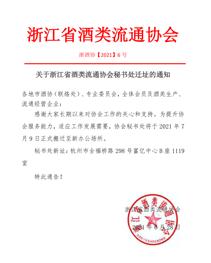 首页 / 要闻 / 连锁经营 / 【乔迁新址】关于浙江省酒类流通协会秘书处迁址的通知
