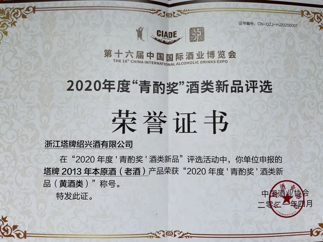 副会长单位:【浙江塔牌】获2020年度“青酌奖”酒类新品大奖
