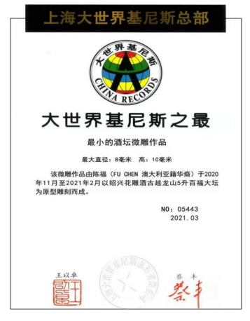 日前,古越龙山澳大利亚总代理澳洲万诚亚太公司组织当地政界、商界名流50余人,在澳大利亚猎人谷(Hunter Valley)举办一场古越龙山酒会,活动中一坛袖珍型的 “彩绘百福”花雕酒全球首次亮相,被大世界吉尼斯世界纪录认证为世界上最小的黄酒大坛微雕作品。