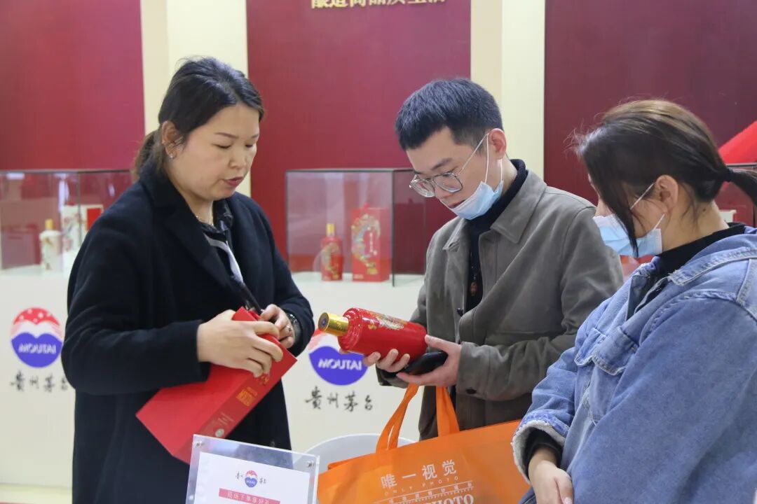 参观的顾客们诉说自己婚礼想要达到的效果和预算,通过咨询我们给这些即将步入婚姻殿堂的新人们出谋划策,跟他们讲解我们的优惠活动政策,客人们也表现出对43度贵州茅台酒喜宴浓厚兴趣和喜爱。