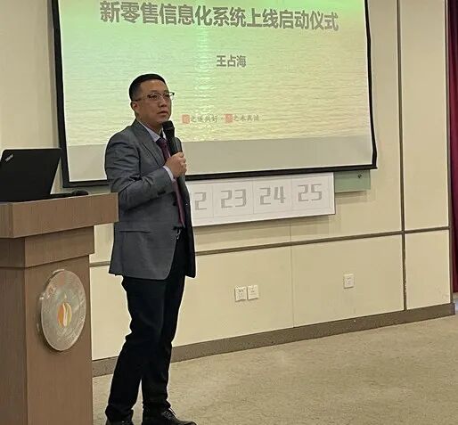 首先,新零售信息化项目领导小组执行副组长王占海作启动仪式的开场致辞。王总表示:新零售信息化系统的上线是基于事实作出的决定。一方面,这是商源建设大中台系统,形成商流、物流、资金流、信息流四位一体大一统的要求;另一方面,久加久新零售项目持续扩张,需要一套信息化工具来武装自己。
