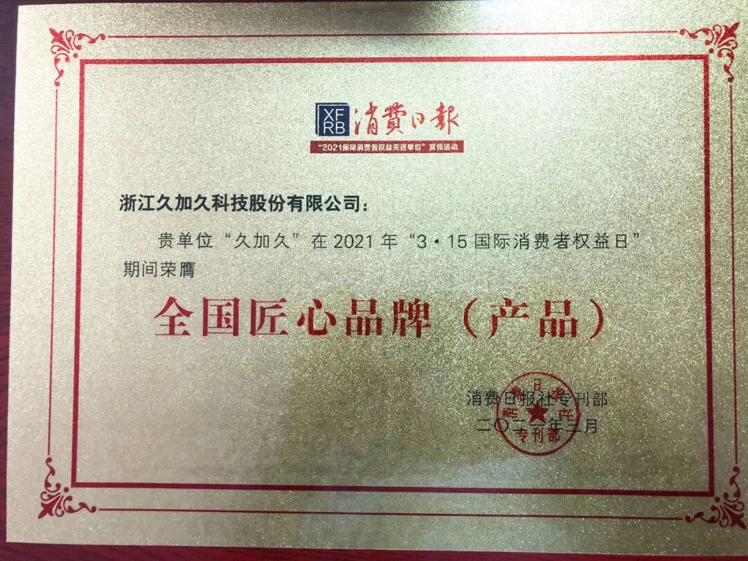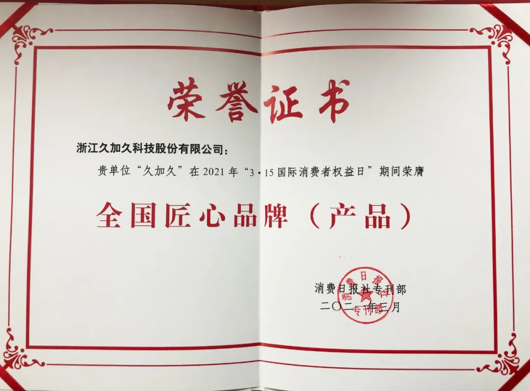 浙江久加久科技股份有限公司荣获“3·15国际消费者权益先进单位”,久加久荣获“全国匠心品牌(产品)”!