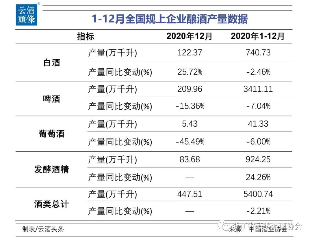 1月19日,中国酒业协会发布2020年度全国酿酒产业产量数据。2020年1-12月,全国酿酒产业规模以上企业酿酒总产量5400.74万千升,同比下降2.21%。具体情况如下表所示: