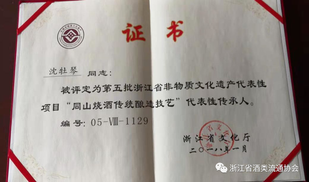🔺2018年1月,沈牡琴被评定为第五批浙江省非物质文化遗产代表性项目“同山烧酒传统酿造技艺”代表性传承人。