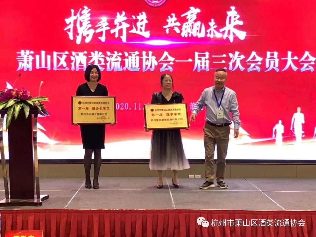 萧山区酒类流通协会会长朱士勇先生为新当选副会长单位杭州永兴酒业有限公司和新当选理事单位杭州华创酒类销售有限公司颁发牌匾。新鲜血液的注入,使协会生生不息,走得更远!