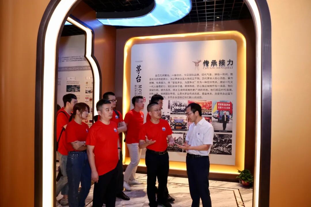 在浙江德道食品有限公司总经理陈均亲自带领及专业讲解下,浙商糖酒集团一行参观体验了杭州茅台体验馆,深入学习了解了茅台的悠久历史文化和独特酿造工艺。