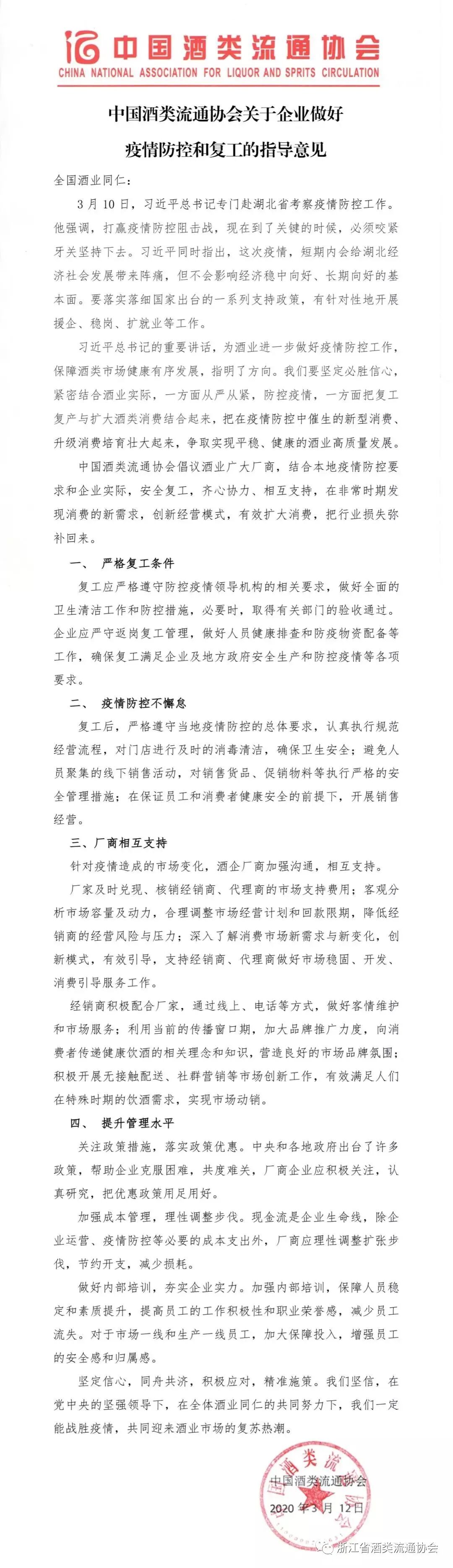 3月12日,中国酒类流通协会发布《关于企业做好疫情防控和复工的指导意见》。...