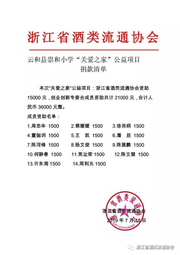 浙江省酒类流通协会主动组织参与多种公益活动,今年6月份,协会组织会员前往云和县崇头镇中心小学,关爱当地留守儿童,并成立“关爱之家”专项基金,为学校留守儿童提供帮助:浙江省酒类流通协会资助15000元,创业创新专委会成员资助共计21000元,合计人民币36000元整。