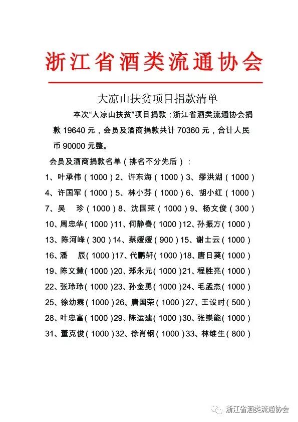 在中国酒类流通协会的倡议下,浙江省酒类流通协会积极响应号召,鼎力援助四川凉山彝族自治州的脱贫与发展:浙江省酒类流通协会捐款19640元,会员及酒商捐款共计70360元,合计人民币90000元整。