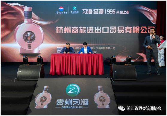发布会现场浙江君习酒业有限公司与浙江久加久食品饮料连锁有限公司、杭州商旅进出口贸易有限公司、壹玖壹玖酒类平台科技股份有限公司等十余家省内酒类知名企业进行了习·酒窖藏1995的合作签约仪式。