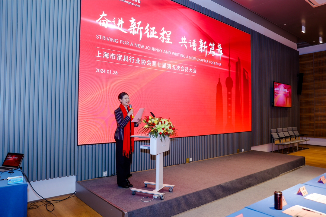 2024年1月26日下午,上海市家具行业协会第七届第五次会员大会在上海亚振家居1865园区会议厅召开。工信部品牌专家组组长周宏宁、上海市经信委综合规划处处长赵广君、上海市经信委都市产业处副处长陈建林、上海市家具行业协会会长高伟以及上海家协会员参加大会。上海市家具行业协会秘书长李霞主持了大会,大会以“奋进新征程,共普新篇章”为主题,回顾2023,展望2024。