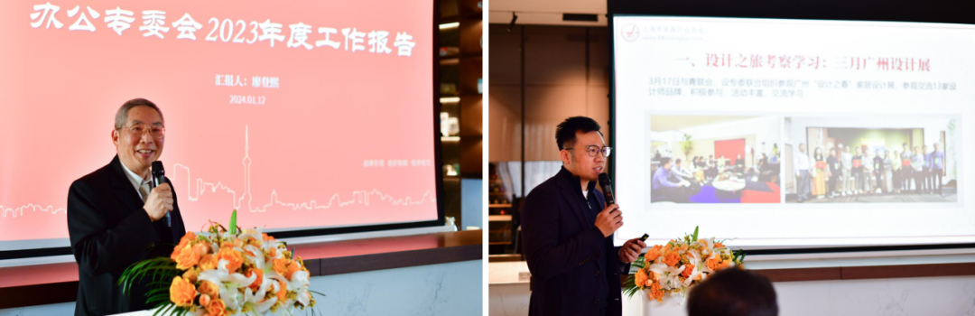 接着,上海家协品牌与传播专委会主任林奋、青联会主席张晶、办公专委会主任单位廖登熙、红木专委会主任单位包浩乾、设计专委会主任单位屠隽立、人才教育专委会主任尹志远分别汇报了各自专委会2023年度工作总结和2024年工作展望。