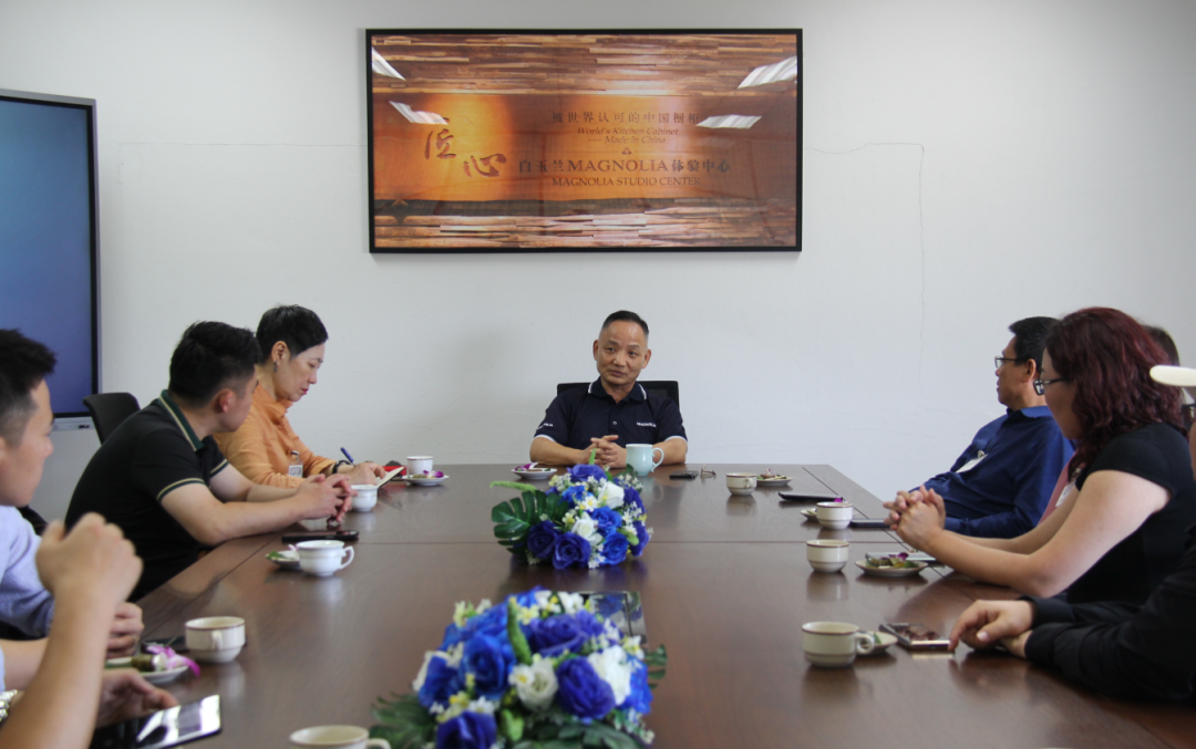 考察团首站来到了白玉兰橱柜,沈忠民董事长对上海家协此次品牌之旅考察团的到来表示热烈的欢迎。他表示,在异国他乡接待家乡同胞,倍感亲切和欣慰。上海家协李霞秘书长表示,上海家协一直关注白玉兰在海外的发展,白玉兰的成功是对上海家具企业的最好的鼓励。