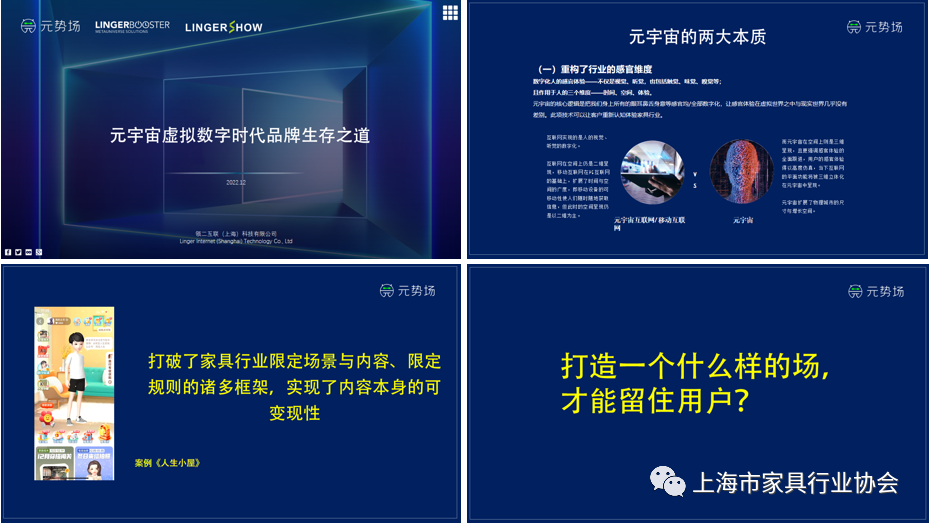 随着数字经济蓬勃发展,作为VR、区块链、5G等多个前沿科技的融合应用体——元宇宙已经从概念走向台前,正从“未来式”加速进入到“现在时”。在元宇宙的浪潮下,人们生活和办公方式将发生变化,家具企业,家具展会的未来将有哪些新模式?本次高峰论坛特邀元宇宙方面专家、学者以及家具企业代表,共同探讨元宇宙与家居的未来。上海家协秘书长李霞主持了论坛。
