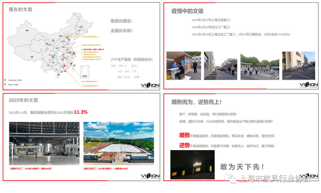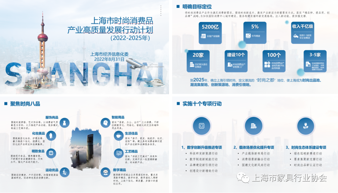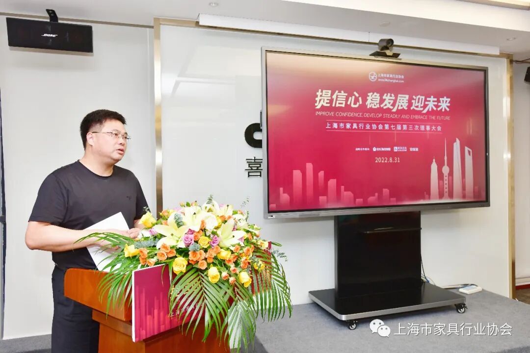 以“提信心 稳发展 赢未来”为主题的上海市家具行业协会第七届三次理事大会,在严格遵守疫情防控要求下,于8月31日在喜盈门国际建材家居品牌中心顺利召开。 本次大会正如大会主题,在疫情过后的艰难时期,为企业提振信心,鼓舞斗志,迎接新的发展机遇,特别邀请上海市经信委都市产业处副处长、调研员由文为大家带来《上海市时尚消费品产业高质量发展行动计划(2022-2025)》解读,邀请上海文信家具集团副总经理唐明辉作《奋战2022》企业成功经验分享。上海市家具行业协会秘书长李霞主持了大会。1、《上海市时尚消费品产业高质量发展行动计划(2022-2025)》解读 时尚家居是时尚消费品产业的重要组成部分,家具企业如何借助时尚消费品产业发展契机,抓住消费升级机遇,完成企业迭代升级?上海市经信委都市产业处副处长、调研员由文在为大家解读《上海市时尚消费品产业高质量发展行动计划(2022-2025)》时,分析了国际时尚消费品产业的发展经验,详细讲解了《行动计划》中的“时尚八品、十个专项行动、三项保障措施”,为时尚消费品产业发展指明了方向。 上海文信家具集团在疫情这三年里,不但没有受到市场冲击,反而实现了突飞猛进的发展,年产值从2018年的3.65亿增长到2021年的6.6亿。今年在市场低迷的情况下,1-6月文信家具集团销售业绩同比2021年增长11.3%。文信家具集团副总经理唐明辉从经营理念、管理思想、战略定位等方面分享了文信的成功经验,给参会企业带来启发和借鉴。 作为本次会议的场地提供方,喜盈门集团运营管理中心运营管理部副总监陈晓峰,代表喜盈门集团对大家的到来表示热烈欢迎,并从产业领域、战略、创新等多方面向大家分享了喜盈门集团的发展历程和经营之道。 上海家协李霞秘书长向大会做了2022年上半年工作报告和下半年工作计划。李霞秘书长从党建工作、疫情期间工作、团标建设、品牌培育、融媒体运营、申报推荐、资源对接等方面总结了上半年工作。又从党建引领、品牌引领、创新赋能、服务规范等四个方面汇报了下半年工作重点。