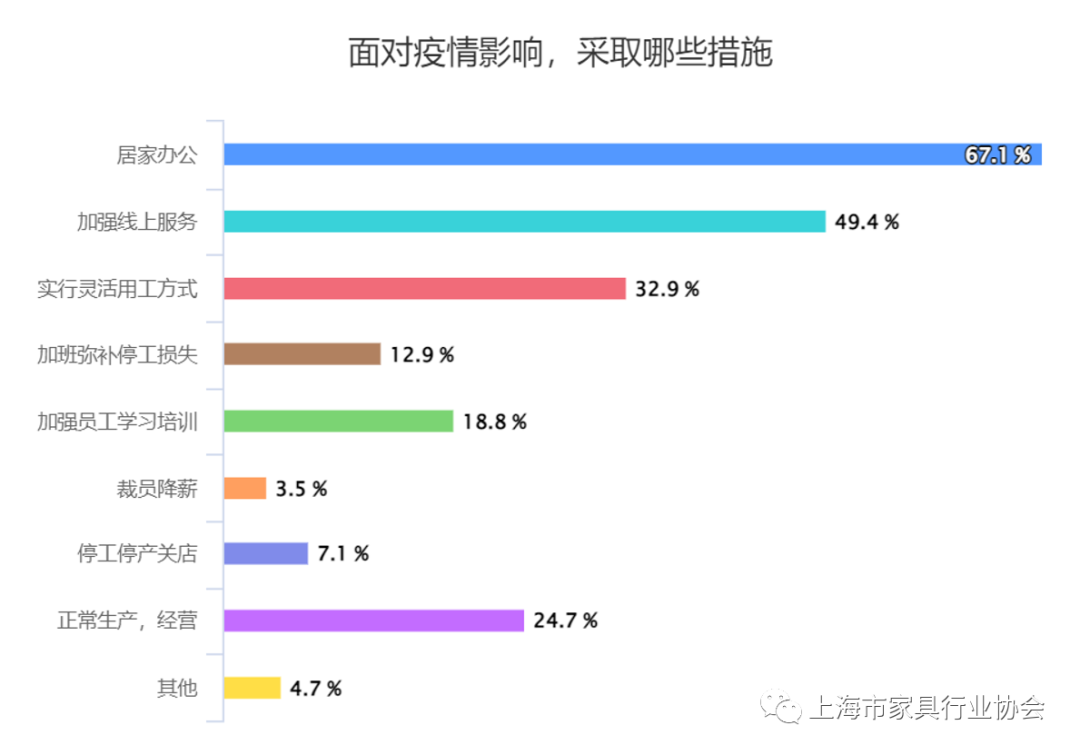 调查中也显示企业正采取积极措施应对疫情。超三分之二的企业采取居家办公,近五成企业加强线上服务,超三成企业实行灵活用工方式,近两成企业利用停工开展员工培训工作。