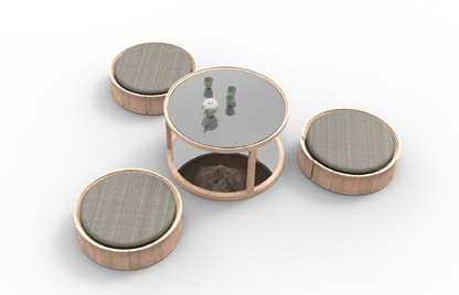 设计说明:一款能在多个场景使用的蒲团,多个垒起来能出现凳子、茶几、床头柜等附属功能。利用五轴技术加工出竹节的复杂造型,增加趣味性。用多层板雕刻的山峦,附着在茶几面板底部,使用者通过镜面反射能看到镜花水月的景观,产生一丝惊喜。产品名称:O CHAIR