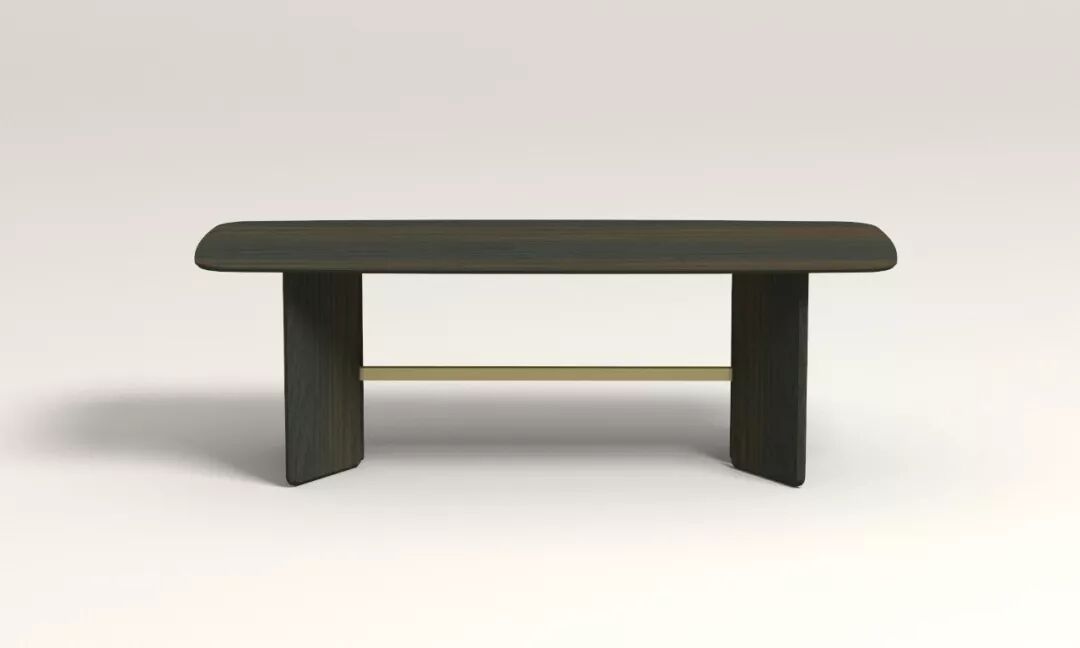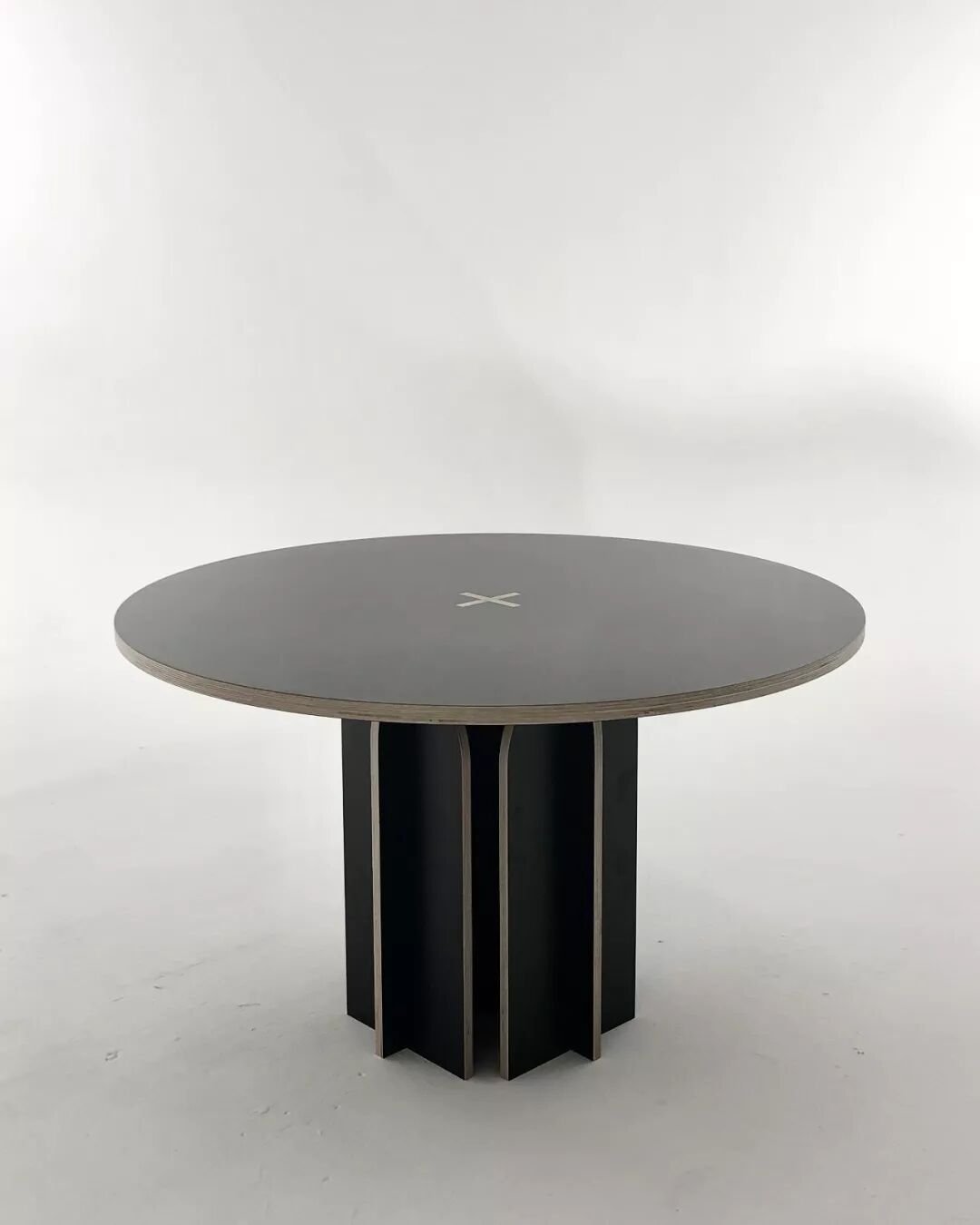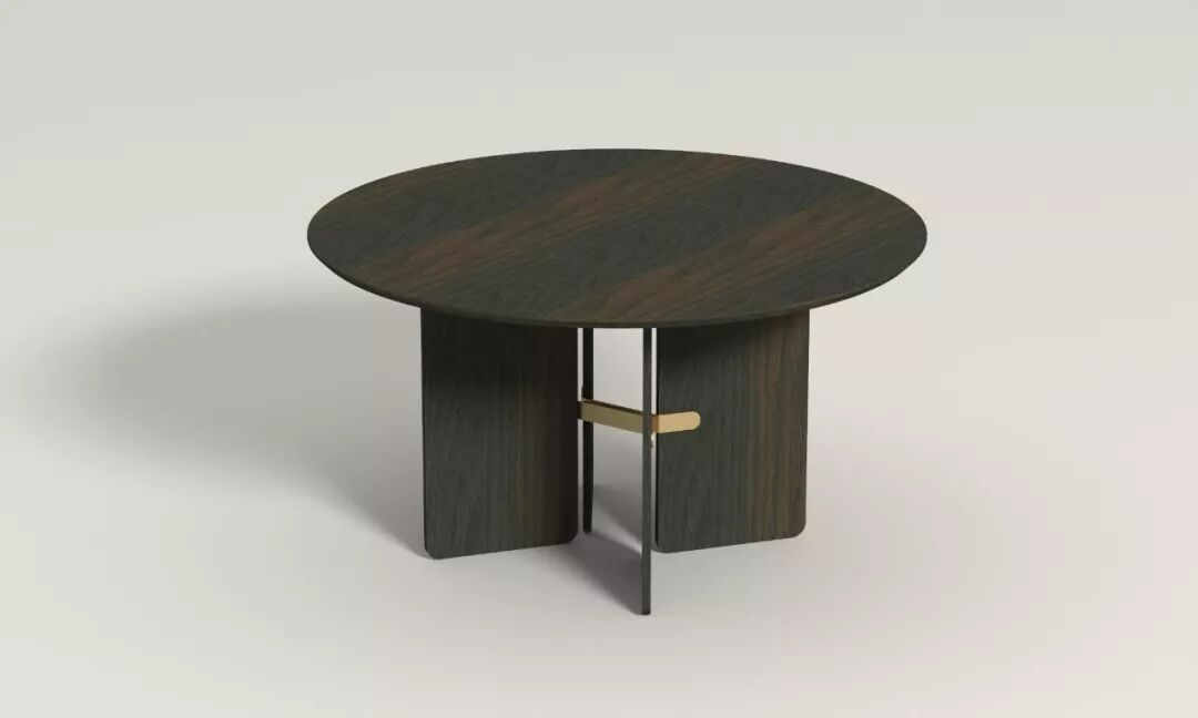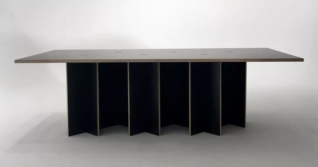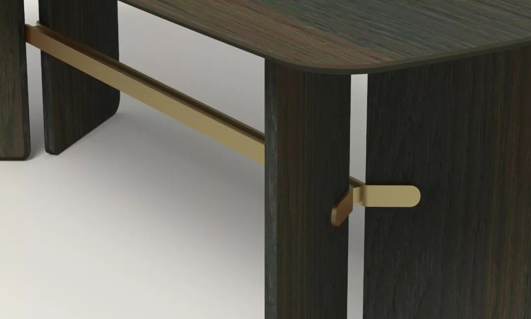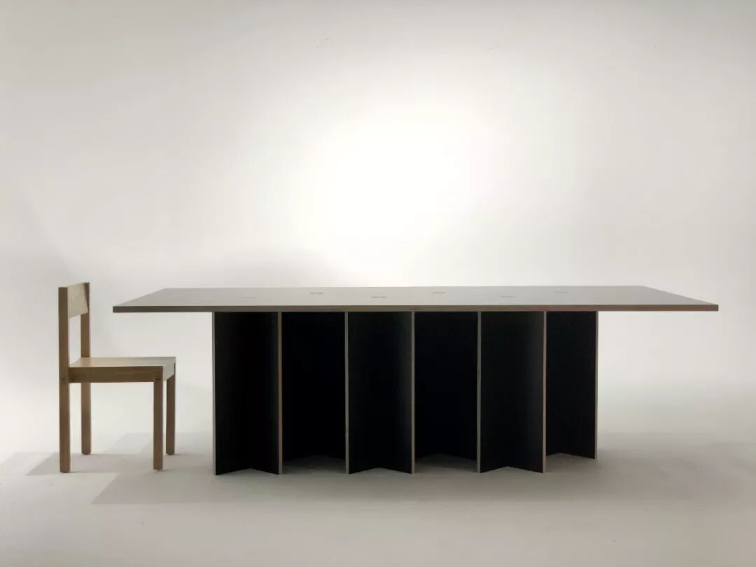 这次一共设计了三个桌子,一个长的餐桌、一个圆的餐桌以及书桌。桌面和腿我们都用平面的层板为基本结构,打破人们对桌子只是一个桌面四条腿的固有观念,用平板的面来作为桌腿的支撑。因为腿是片状,同时每个腿面板之间还有缝隙,这就会让人不会感觉到笨重,反而有一种轻薄感,在不同角度观看会有不同的感受。桌腿之间用金属条作为横档,在金属横梁和面板腿之间的结合上,我们希望保持这种通透感,同时在稳固性上会有增强,在一些金属的细节处理上我们希望保持干净、整洁、同时又很直接的设计语言,让整个产品有细节的同时可以融于整体。