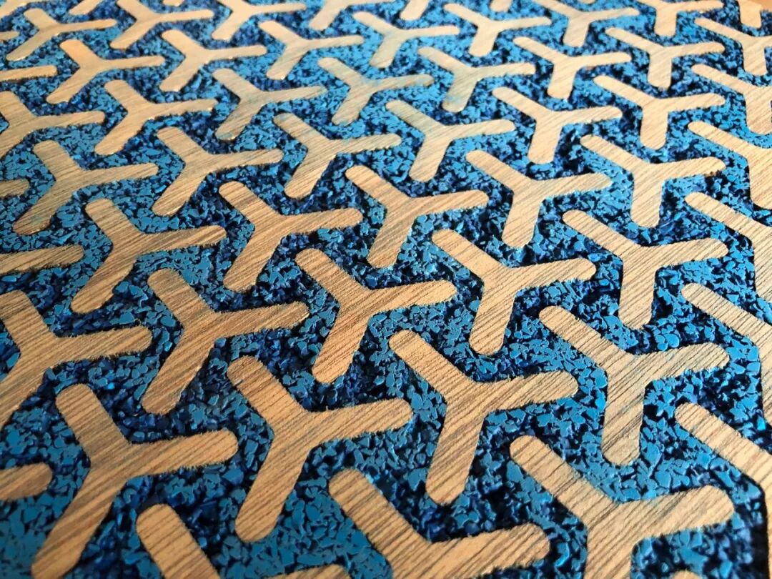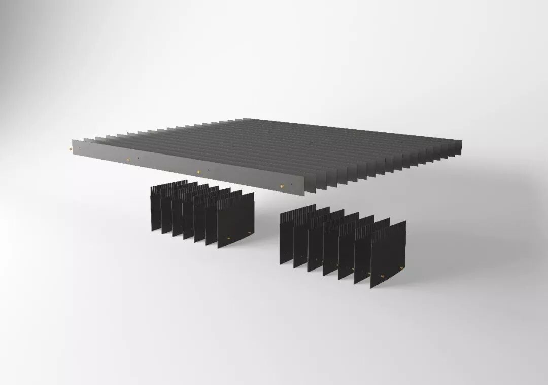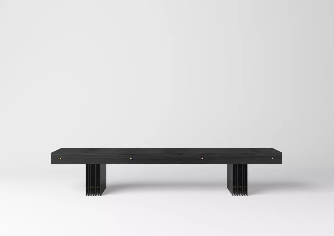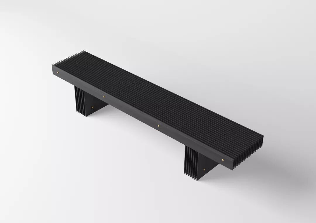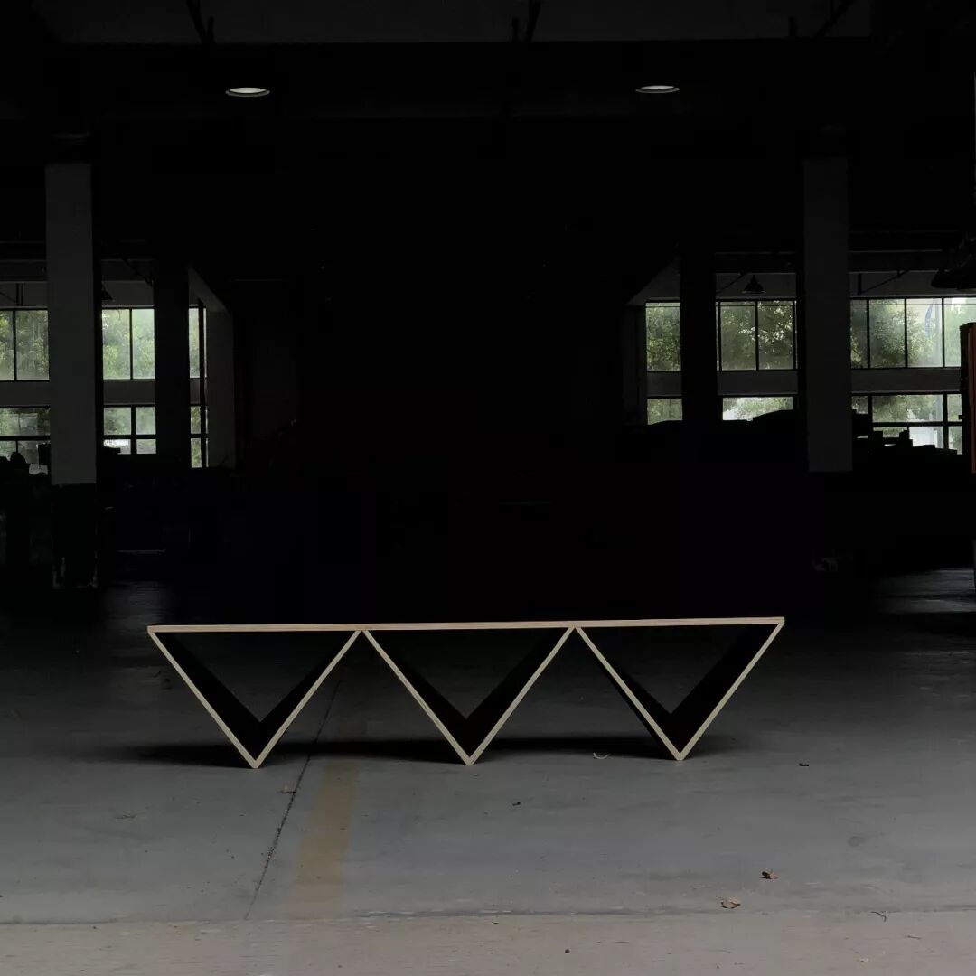 栅格在图像处理中是将图像中的指令转换为像素,基于此,蔡烈超对基本形态的长凳做了栅格化处理,以 5mm的薄胶合板片作为像素化后的基本单元,横向与纵向的薄片通过垂直插接形成稳固的结构方式。隐藏的插接结构,让薄片之间看似不相关联,进而每一片在视觉上呈现漂浮感和不稳定的临界状态。轻薄通透的属性与视觉的重量感形成的反差更增添产品的戏剧性。