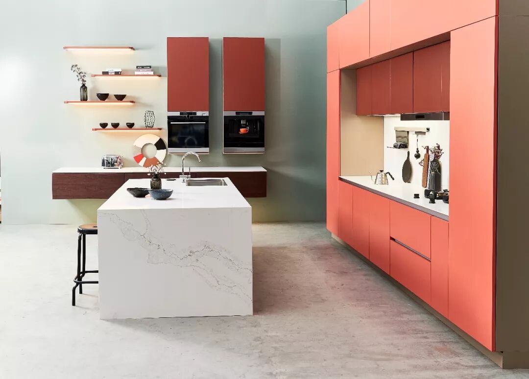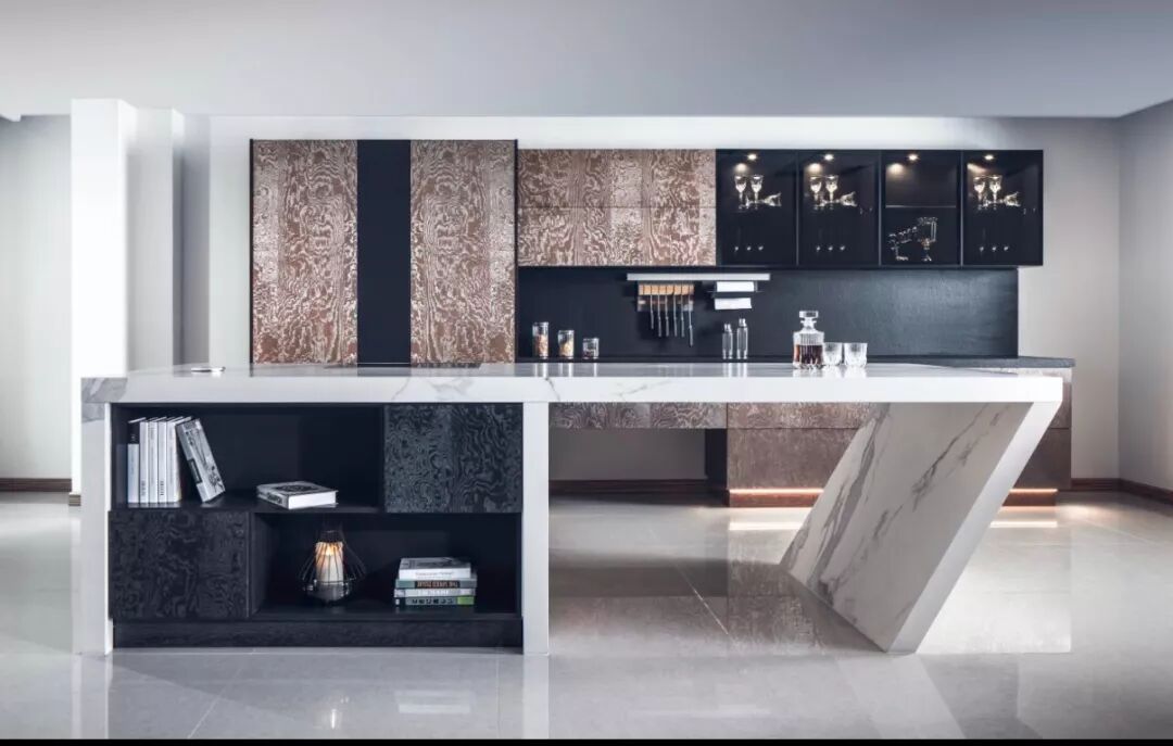 格调中岛最大的特点是外露的基材层板截面,根据使用功能分割,在视觉上有效降低了传统中岛的厚重的体量感