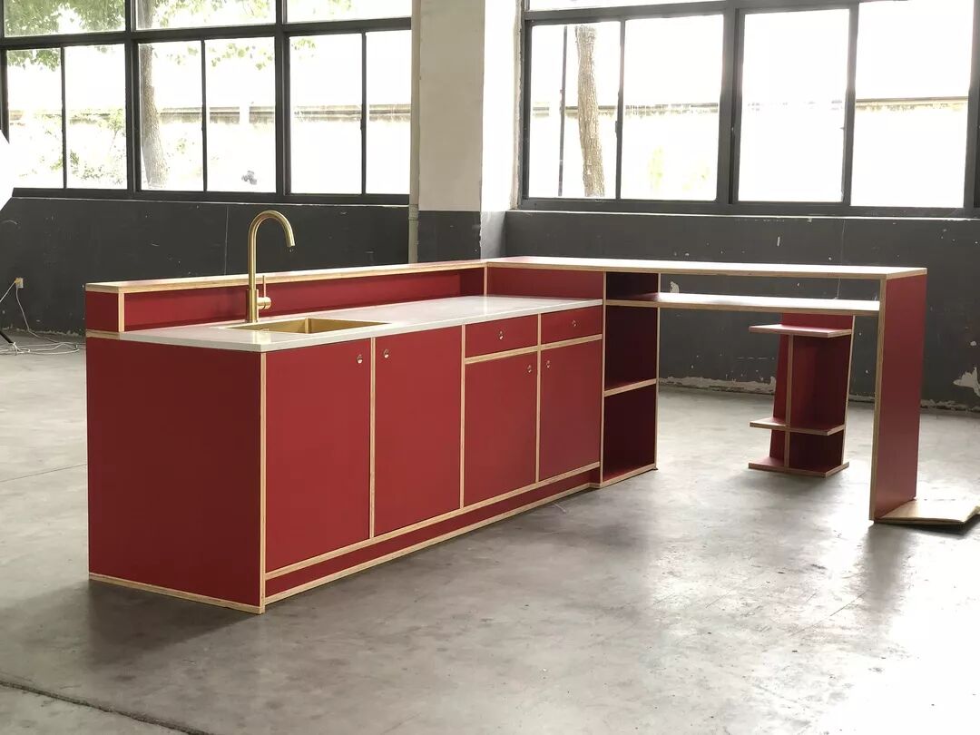 层板有很多实木不具备的材料特性,层板可以热压弯曲,而且不容易开裂。这次参展的长桥凳腿部弧面三角结构就完美的展现了层板可以曲面弯曲的特性。另外中岛和衣柜上大平面的烤漆也体现了层板良好的油漆附着性能,不开裂。同时也展现了合作生产企业白玉兰扎实的水性漆工艺。