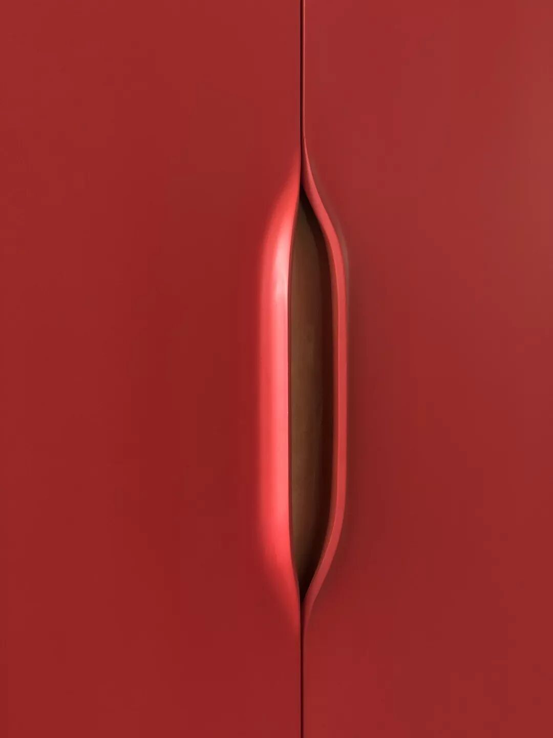 俏衣柜有趣的地方是门把手,就像掀起的一块衣角,凸起的部分与门板的平面完美过渡,浑然一体,同时露出内侧的漂亮的黄铜件。