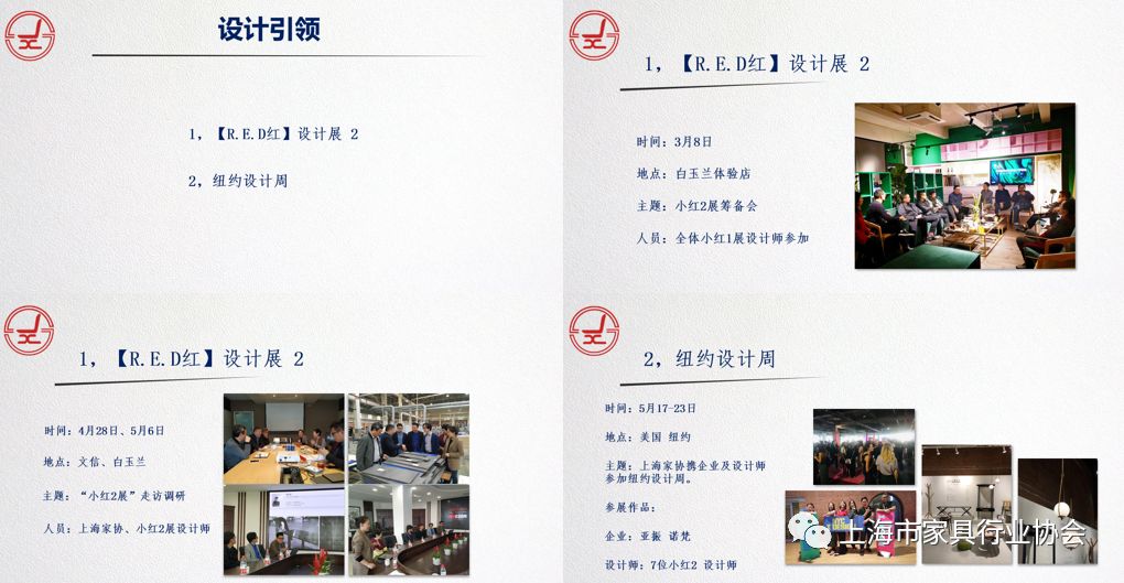 1-5月工作汇报,分别为:党建、品牌建设、设计引领、观展、诚信体系建设、融媒体建设、家协青联会、《轻工志家具篇》。