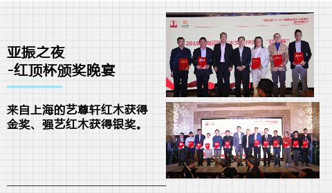 2018上海国际红木文化博览会红顶杯颁奖晚会,颁发了红顶创意奖、红顶铜奖、银奖、金奖,最佳组织奖等奖项;其中来自上海的艺尊轩红木获得金奖、强艺红木获得银奖。
