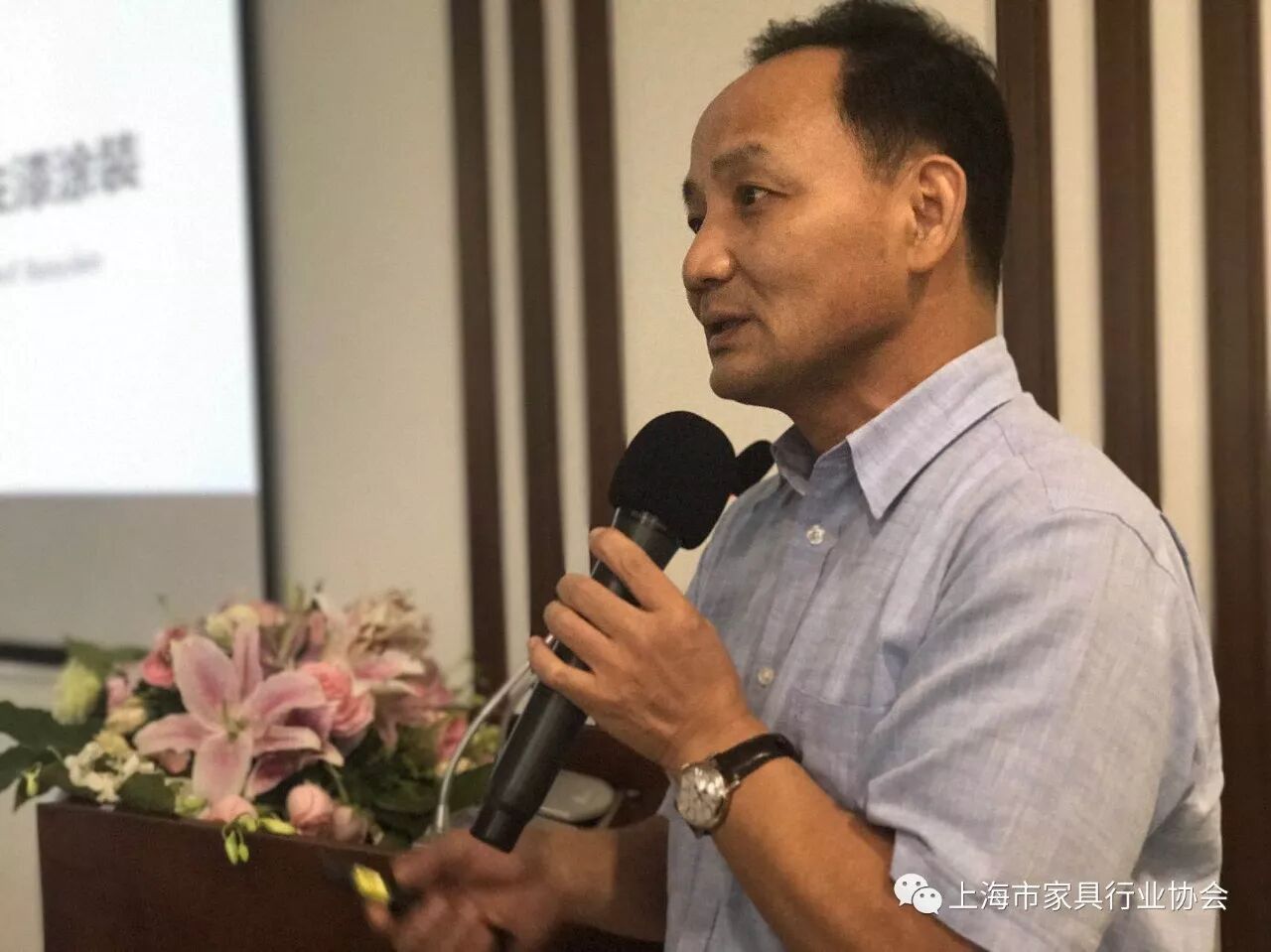 沈忠民董事长作《生命周期分析:白玉兰橱柜的水性漆涂装》交流分享,介绍了白玉兰家具“油改水”的历程,并和与会代表们分享了白玉兰绿色环保改造的成功经验和成果。